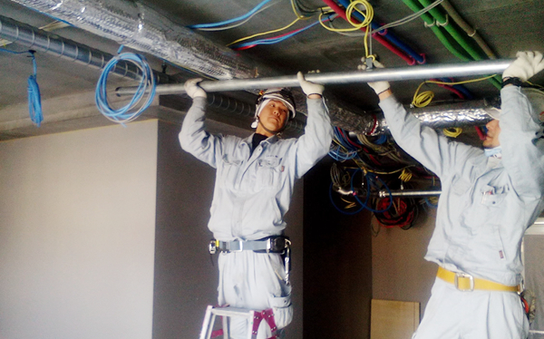 建物の用途や規模、収容人数に応じて設置が義務づけられている「消防用設備」。スプリンクラーや消火栓といった消火設備の施工は、法的にも社会的にもニーズが安定しており、今後も欠かせない分野です。 私たちは主に大阪府を中心に関西一円の大型ビルや高層マンション、商業施設などを対象に、スプリンクラー・屋内消火栓などの設置工事を行っています。 火災から人々の命や暮らしを守る、社会インフラの一端を担うやりがいある仕事です。